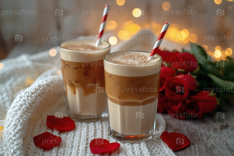 Концепт кафе или кафе в честь Дня святого Валентина. Вкусный многослойный кофе в прозрачном стакане, сердца и лепестки роз крупным планом