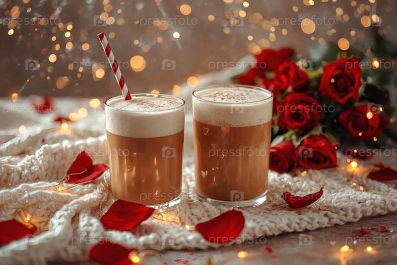 Концепт кафе или кафе в честь Дня святого Валентина. Вкусный многослойный кофе в прозрачном стакане, сердца и лепестки роз крупным планом
