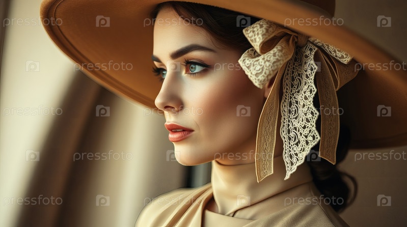Минимализм. Студийный портрет стильной, элегантной женщины в ретро платье и большой шляпе с луком. Мода 1950-х годов. В прошлом веке
