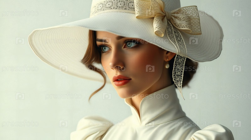 Минимализм. Студийный портрет стильной, элегантной женщины в ретро платье и большой шляпе с луком. Мода 1950-х годов. В прошлом веке