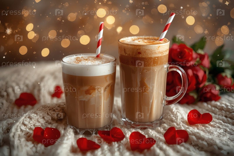 Концепт кафе или кафе в честь Дня святого Валентина. Вкусный многослойный кофе в прозрачном стакане, сердца и лепестки роз крупным планом