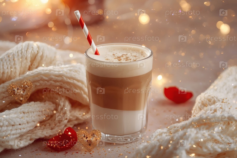 Концепт кафе или кафе в честь Дня святого Валентина. Вкусный многослойный кофе в прозрачном стакане, сердца и лепестки роз крупным планом