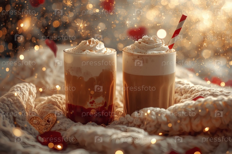 Концепт кафе или кафе в честь Дня святого Валентина. Вкусный многослойный кофе в прозрачном стакане, сердца и лепестки роз крупным планом