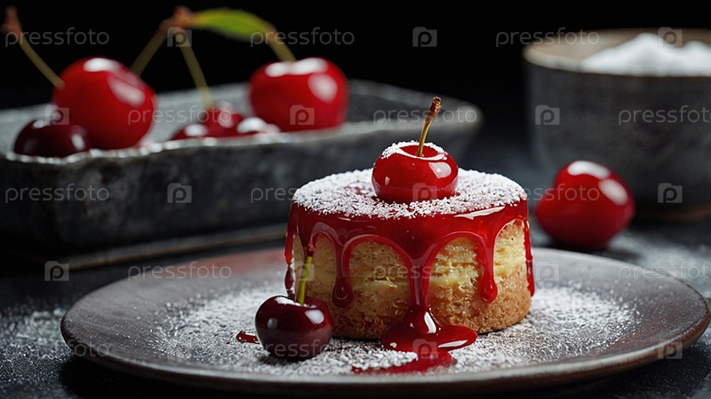Вкусный, губчатый торт с вишней с украшением в виде вишни на серой керамической пластине. Очень вкусный десерт крупным планом