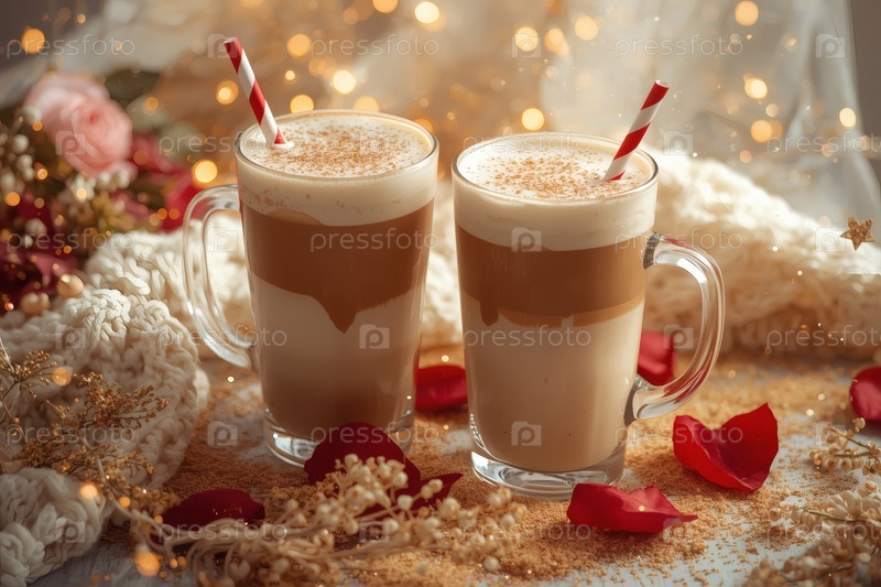 Концепт кафе или кафе в честь Дня святого Валентина. Вкусный многослойный кофе в прозрачном стакане, сердца и лепестки роз крупным планом