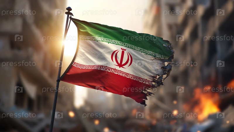 Иранский флаг на фоне разрушенных войной городов