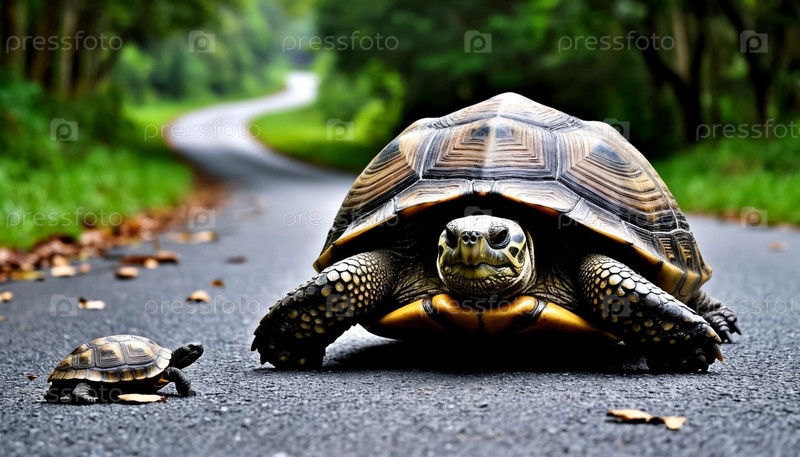 Черепаха ползает по дороге со своим ребенком. Правила дорожного движения, скорость. Генерируется ИИ