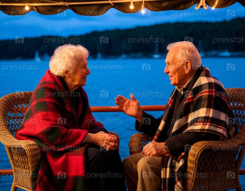 Пожилая пара на палубе корабля вечером. Романтика, любовь, отношения. Круиз. Генерируется ИИ