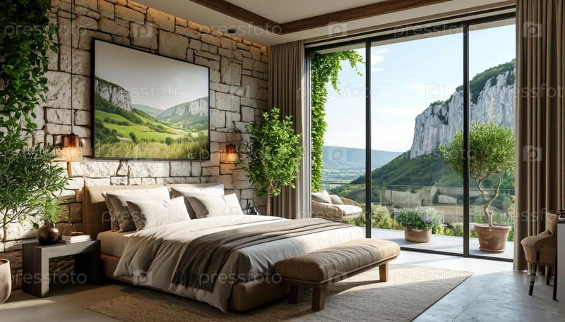 Роскошная гостиничная спальня в горах, панорамное окно. Генерируется ИИ