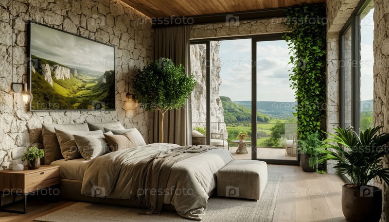 Роскошная гостиничная спальня в горах, панорамное окно. Генерируется ИИ