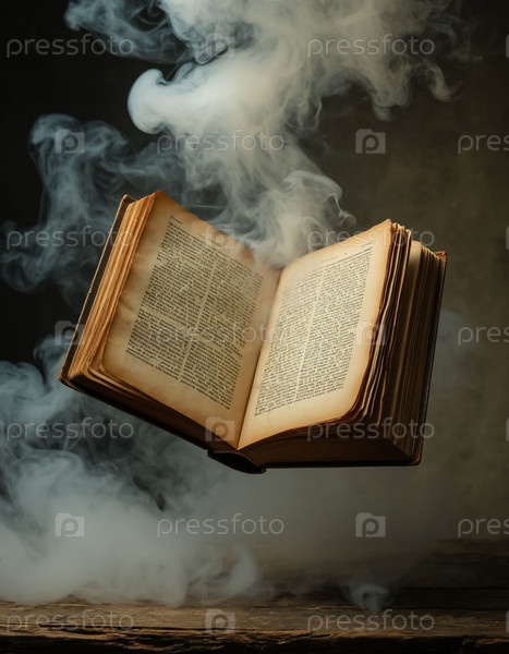 Старая книга со страницами, разлетающимися на части, парит в воздухе на фоне дыма. Сгенерированный ИИ