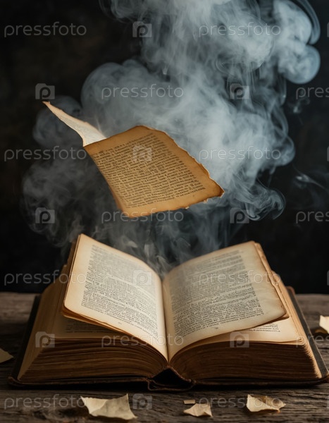 Старая книга со страницами, разлетающимися на части, парит в воздухе на фоне дыма. Сгенерированный ИИ