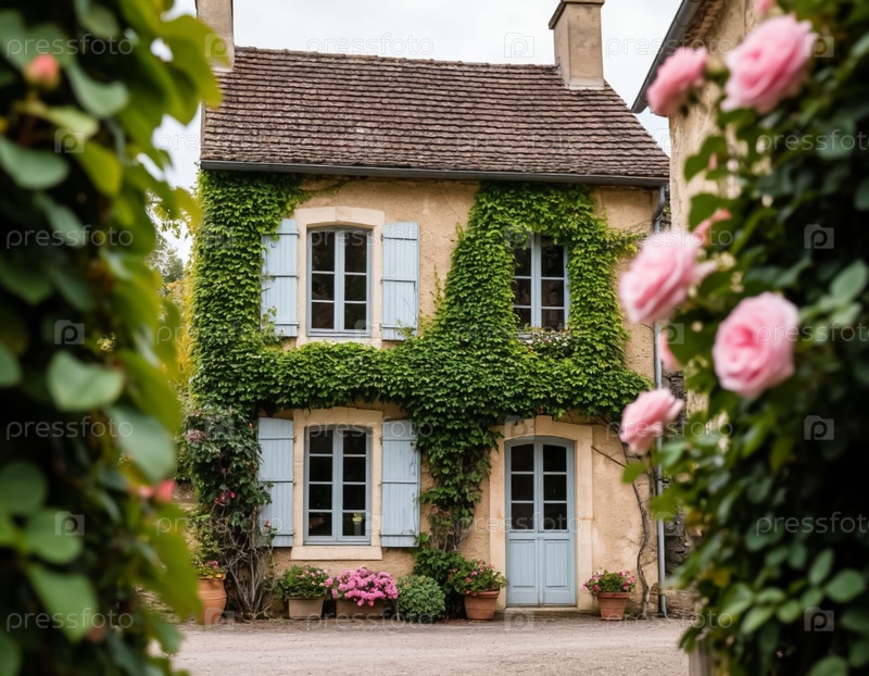 Фасад старого французского дома, переплетенный с розами и плющом, винтажный и ретро-стиль. Генерируется ИИ