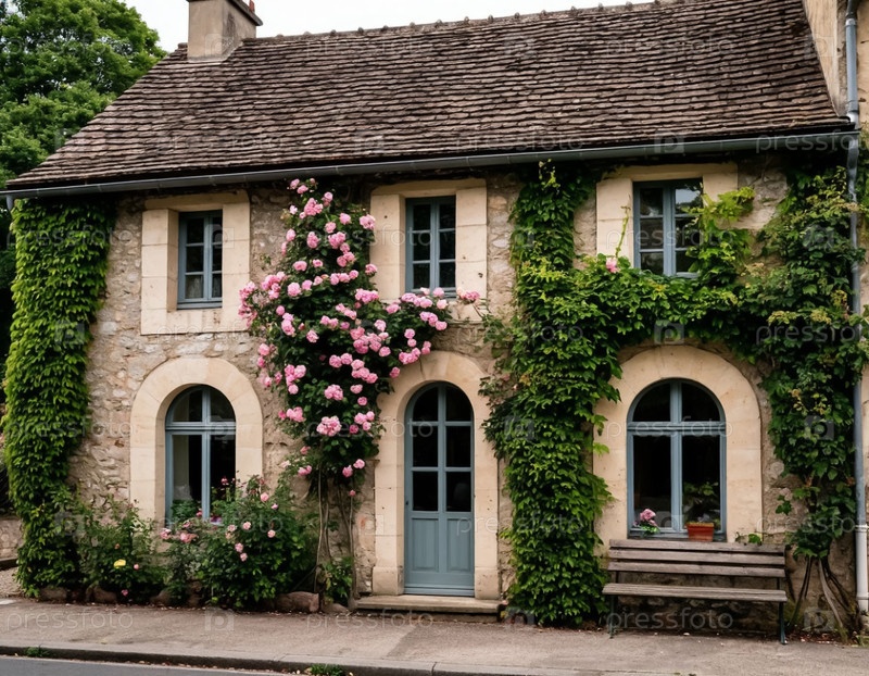 Фасад старого французского дома, переплетенный с розами и плющом, винтажный и ретро-стиль. Генерируется ИИ