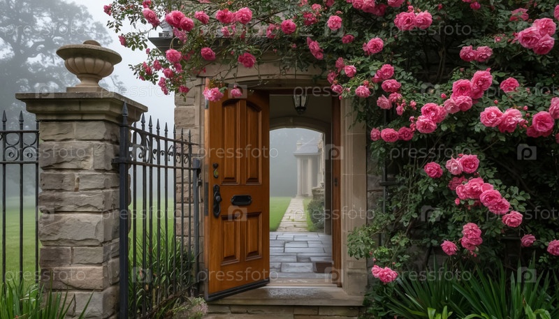 Деревянный дубовый дверной кошелек к саду старого дома, лазающий по розам. Генерируется ИИ