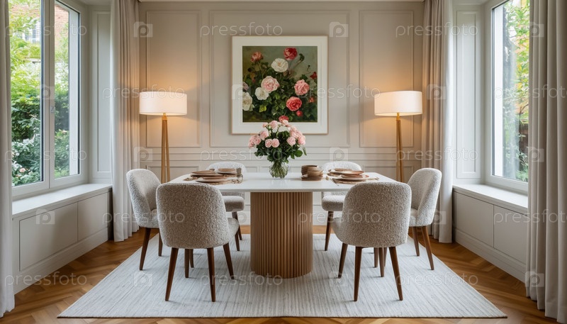 Интерьер столовой в квартирах в светлых тонах. Удобство и чистота. Генерируется ИИ