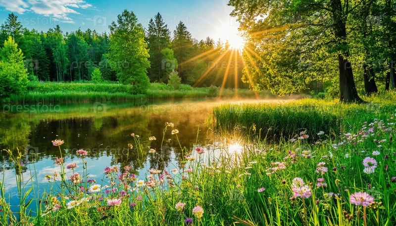Красивый летний пейзаж у реки, солнце, цветы. Генерируется ИИ