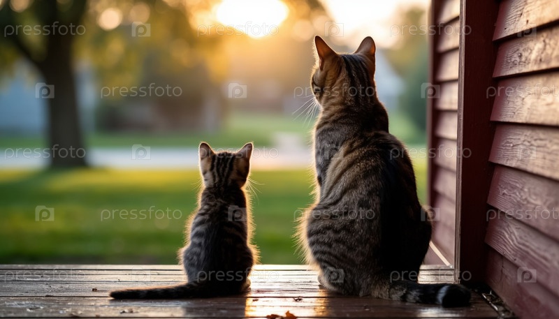 Кошка и ее котенок сидят на крыльце деревенского дома и наблюдают за восходом солнца. Сгенерированный ИИ