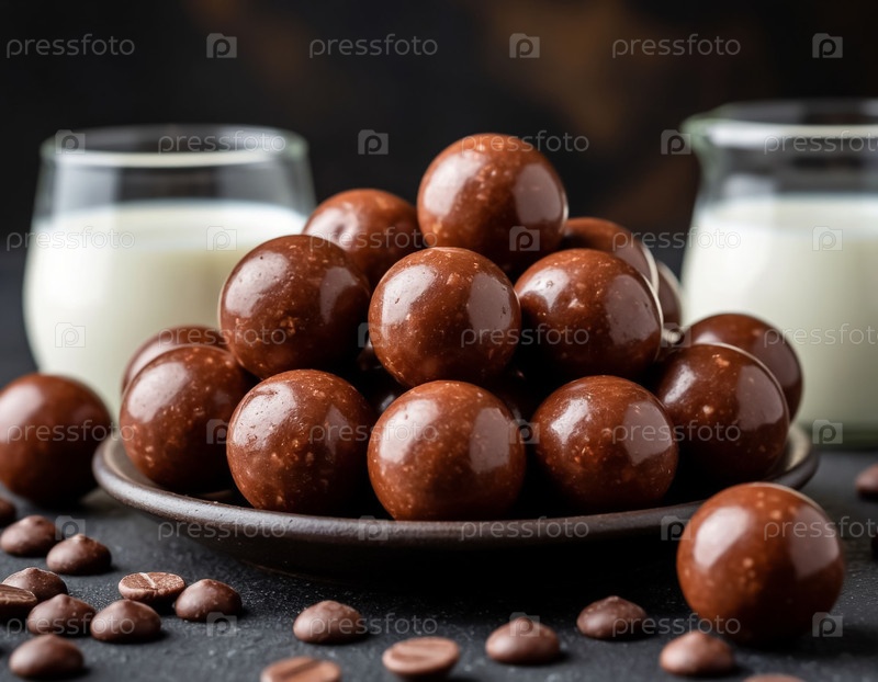 Шоколадные шарики и молоко на столе. Создан компанией Ai