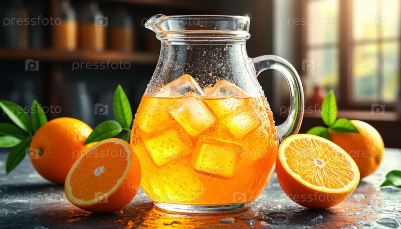 Апельсиновый сок в стеклянном карафе со льдом, загородный натюрморт. Генерируется ИИ