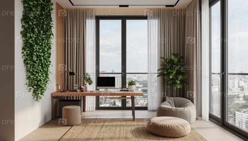 Интерьер небольшого офиса с панорамными окнами в многоэтажном здании. Генерируется ИИ