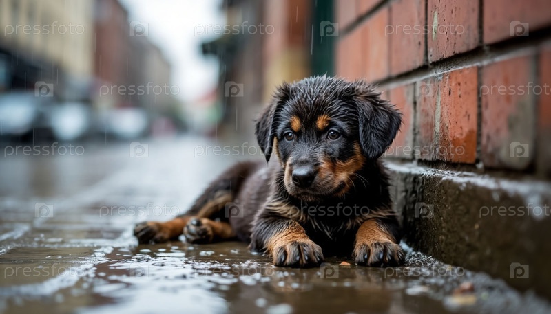 Бездомный щенок, к сожалению, мочится под дождем в городе. Генерируется ИИ
