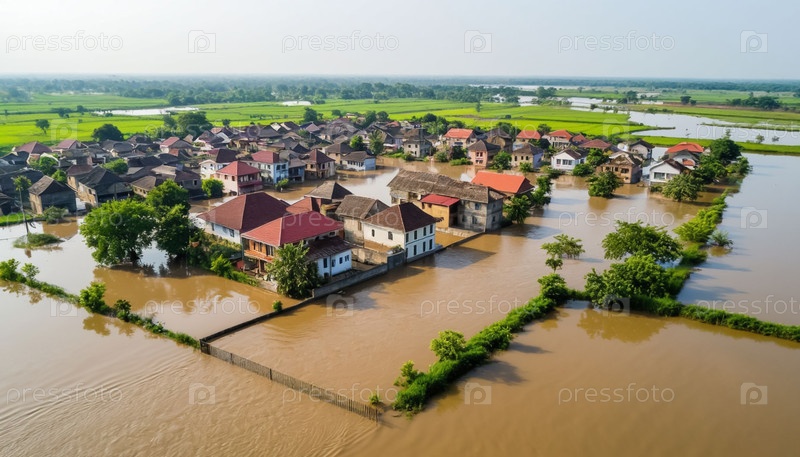 Наводнение, вид на деревню в воде. Сгенерированный ИИ
