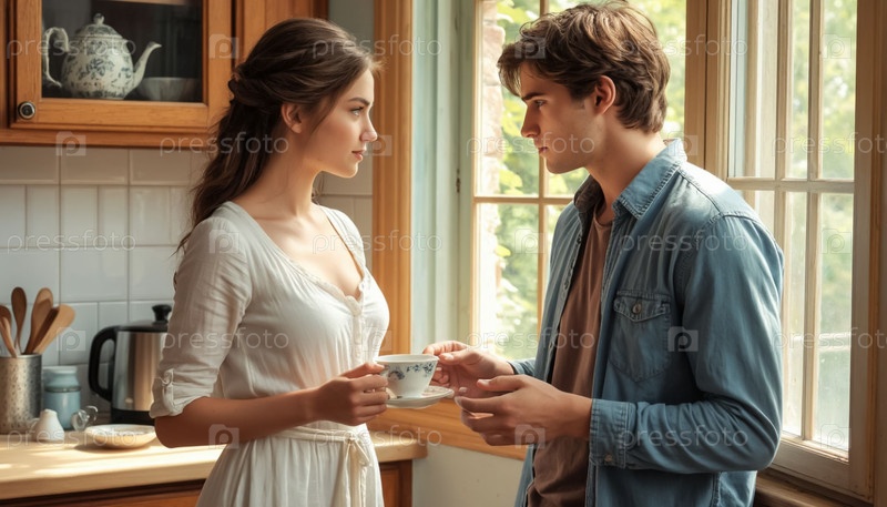 Парень и девушка на кухне пьют чай. Сгенерированный ИИ