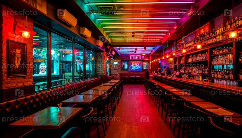 Интерьер ночного бара с цветным освещением. Сгенерированный ИИ