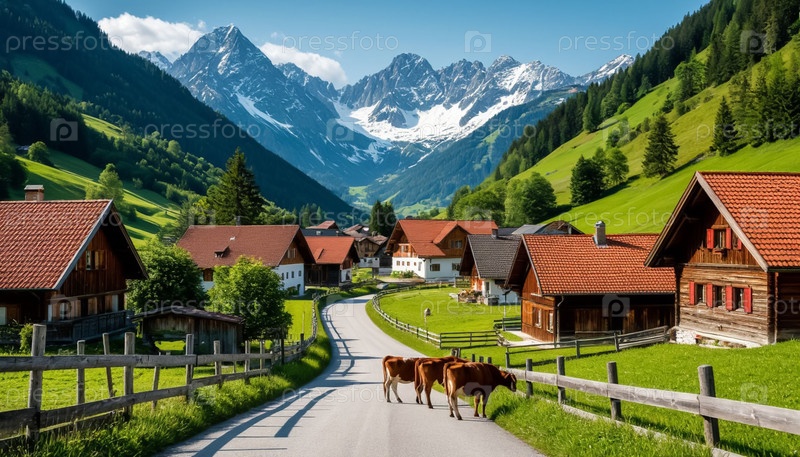 Прекрасный летний пейзаж: альпийская деревня в горах. Сгенерированный ИИ