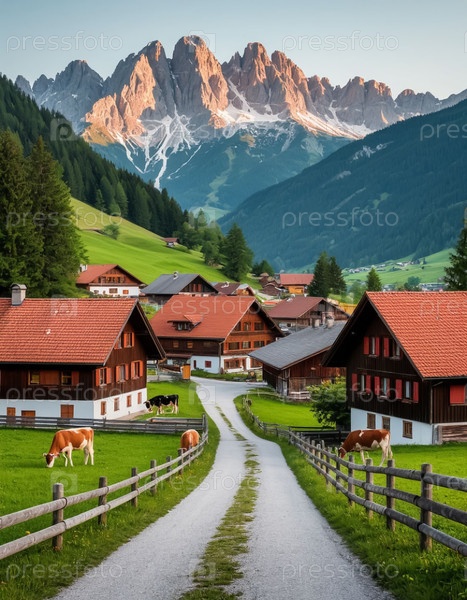 Прекрасный летний пейзаж: альпийская деревня в горах. Сгенерированный ИИ