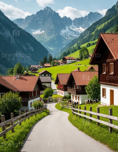 Прекрасный летний пейзаж: альпийская деревня в горах. Сгенерированный ИИ