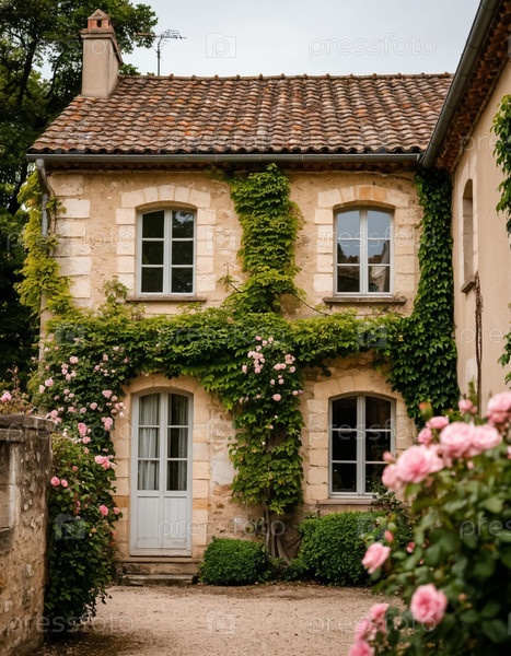 Фасад старого французского дома, переплетенный с розами и плющом, винтажный и ретро-стиль. Генерируется ИИ