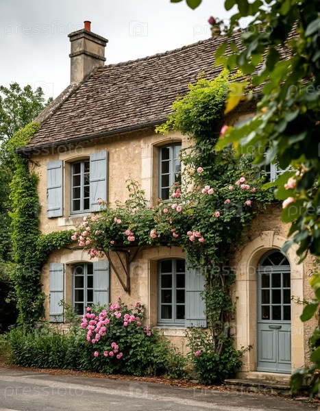 Фасад старого французского дома, переплетенный с розами и плющом, винтажный и ретро-стиль. Генерируется ИИ