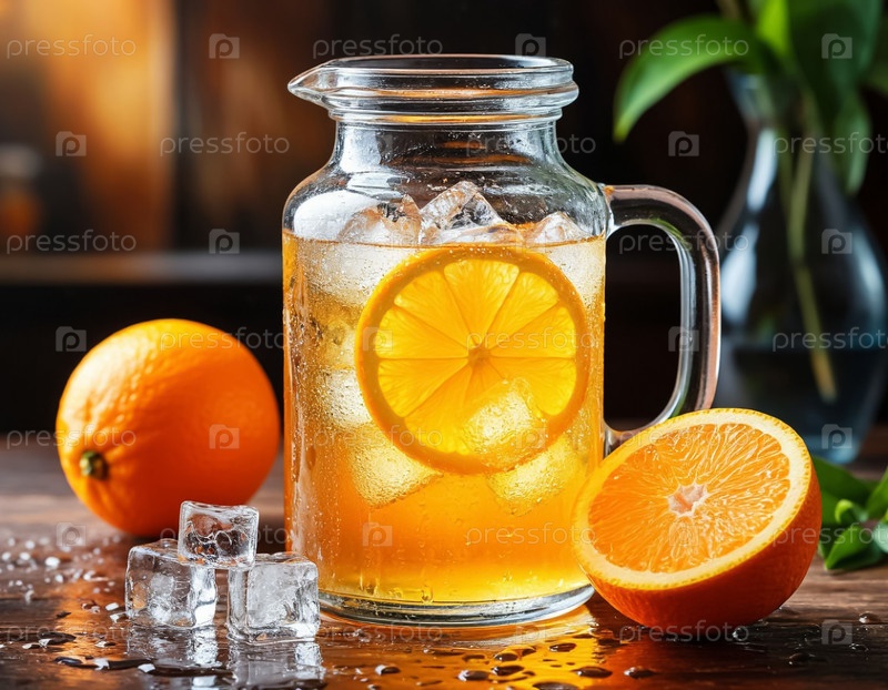 Апельсиновый сок в стеклянном карафе со льдом, загородный натюрморт. Генерируется ИИ
