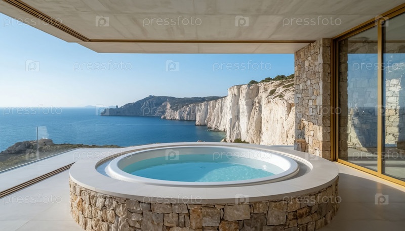 Интерьер роскошной ванной комнаты с панорамным окном и круглым джакузи, вид на море и скалы, отель. Генерируется ИИ
