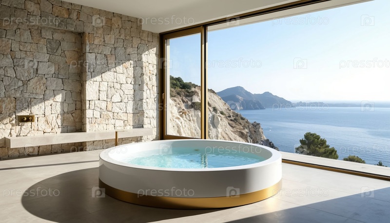 Интерьер роскошной ванной комнаты с панорамным окном и круглым джакузи, вид на море и скалы, отель. Генерируется ИИ