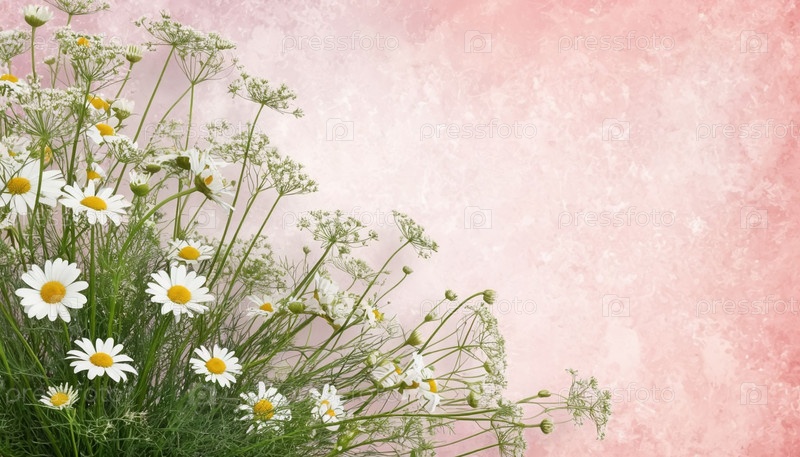Розовый фон с цветочным расположением белых цветов и зелени в углу, копирование пространства. Генерируется ИИ