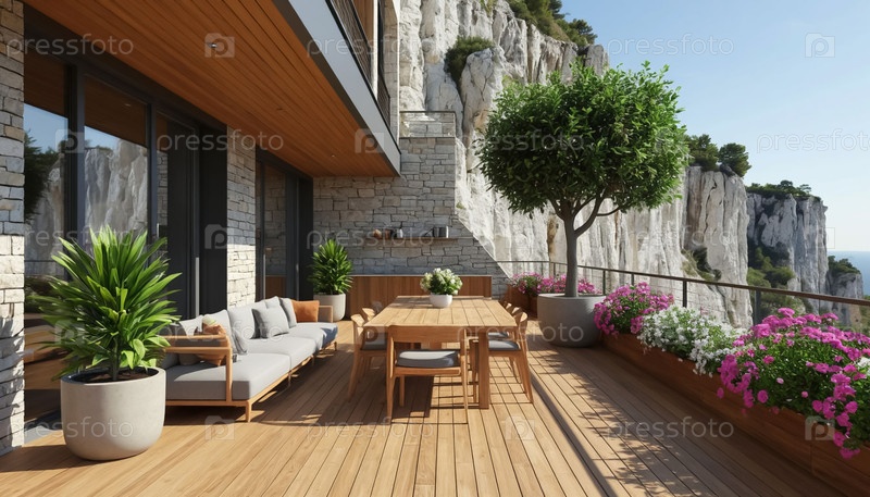 Интерьер летней террасы с обеденной зоной в горном отеле. Генерируется ИИ