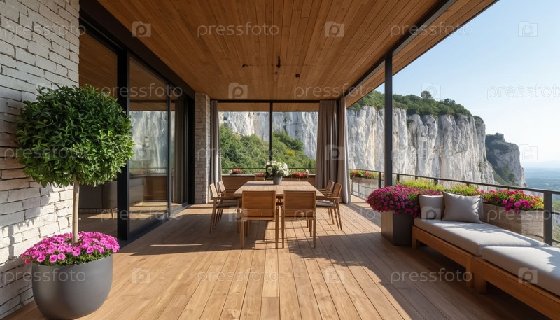 Интерьер летней террасы с обеденной зоной в горном отеле. Генерируется ИИ