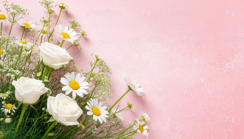 Розовый фон с цветочным расположением белых цветов и зелени в углу, копирование пространства. Генерируется ИИ