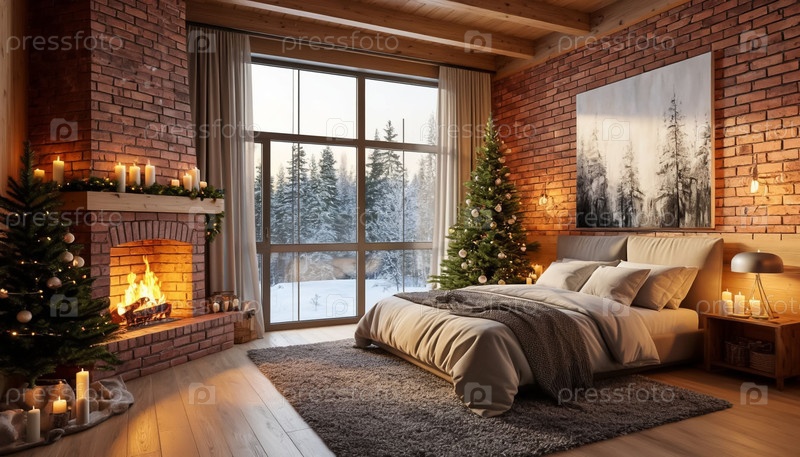 Спальня загородного коттеджа с рождественской елкой, панорамные окна, камин. Отель или квартира на выходные. Генерируется ИИ