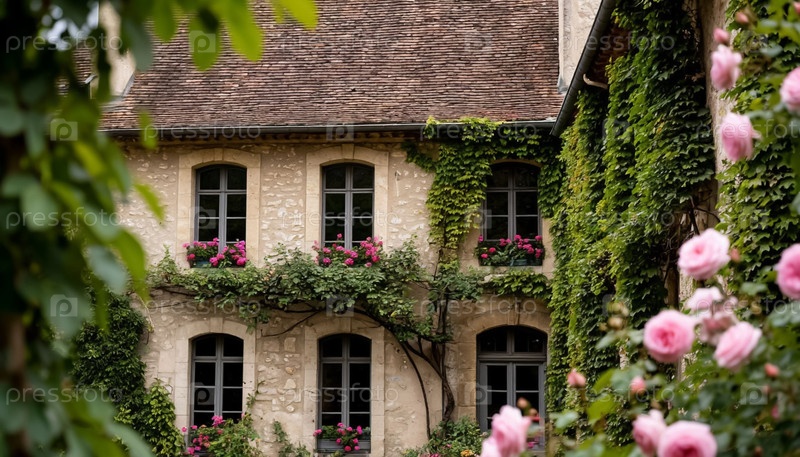 Фасад старого дома, переплетенный с розами и плющом, ретро-стиль. Генерируется ИИ