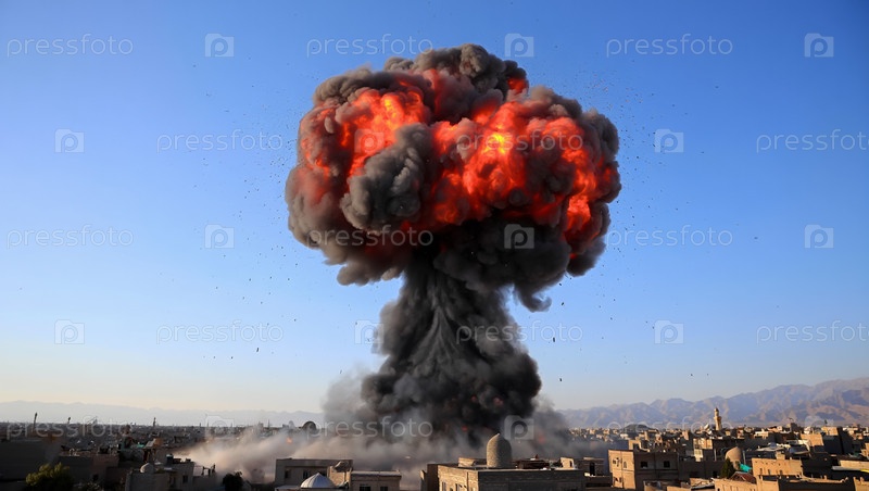 Мощный взрыв и взрыв снарядов над восточным городом. Ирано-израильский военный конфликт. Сгенерированный ИИ