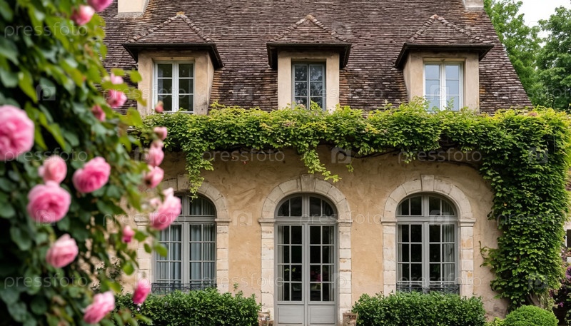 Фасад старого дома, переплетенный с розами и плющом, ретро-стиль. Генерируется ИИ