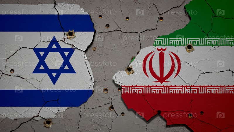 Два флага Ирана и Израиля на разбитой стене. Сгенерированный ИИ