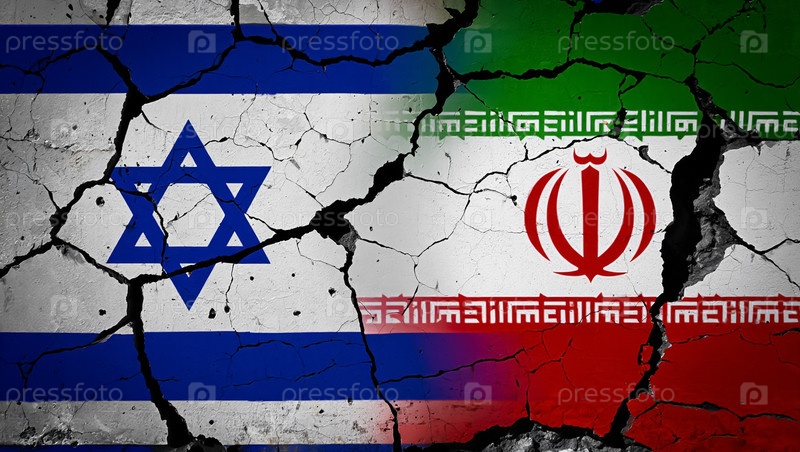 Два флага Ирана и Израиля на разбитой стене. Сгенерированный ИИ