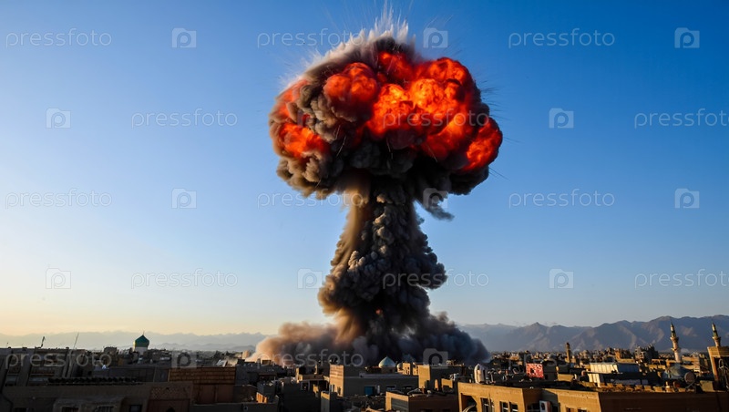 Мощный взрыв и взрыв снарядов над восточным городом. Ирано-израильский военный конфликт. Сгенерированный ИИ