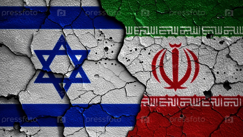 Два флага Ирана и Израиля на разбитой стене. Сгенерированный ИИ