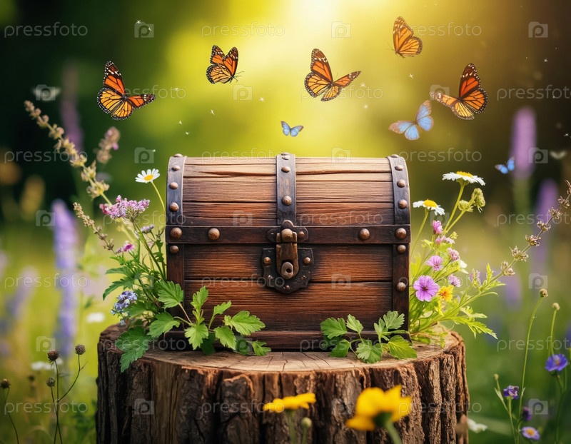 Волшебная грудь на пеньке, летние травы, цветы и бабочки, 3D-искусство